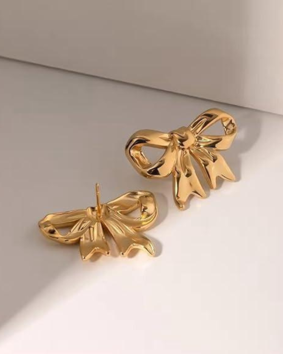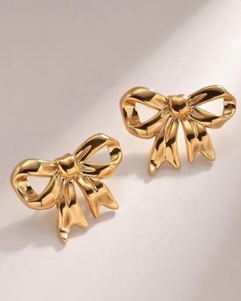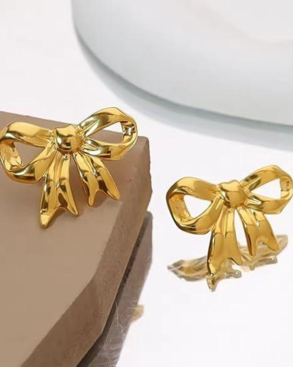 Polished gold bow-shaped earrings with a sculpted silhouette, designed for effortless elegance and everyday luxe styling.
