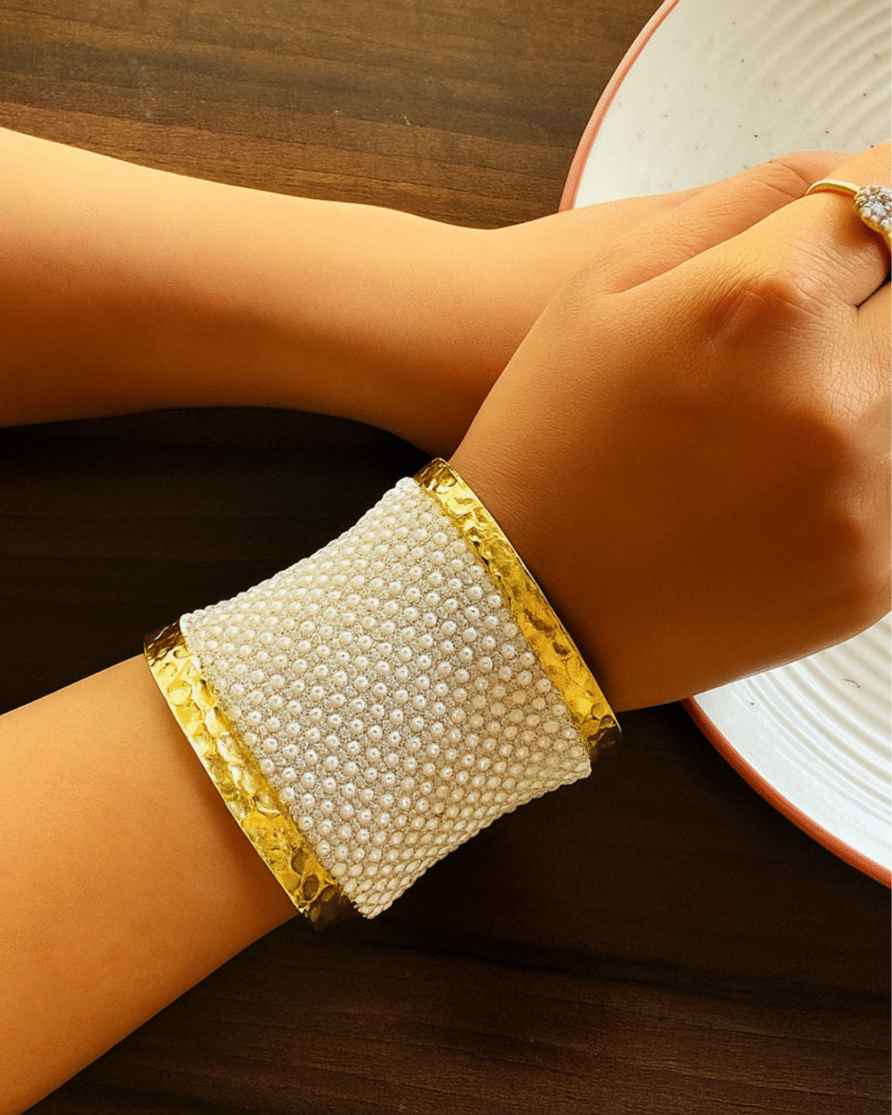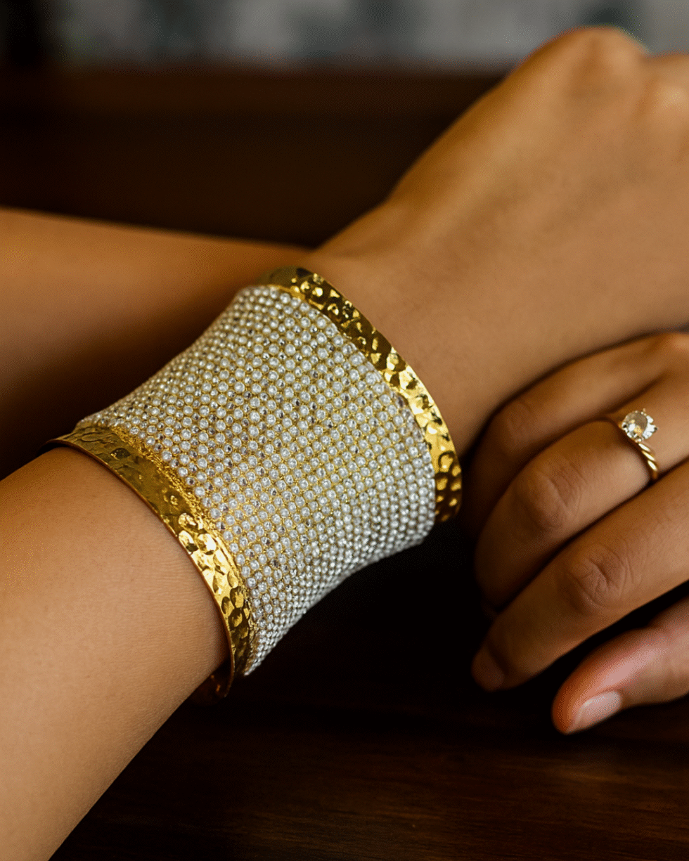 The Aurora Cuff by VIKTAMNA is the ultimate statement of luxury and glamour. Encrusted with shimmering stones on a golden frame, this bangle captures light from every angle, making your presence unforgettable. Its bold yet elegant design makes it perfect for weddings, festive celebrations, and grand occasions. Radiant, sophisticated, and timeless – this is not just a bangle, it’s a sparkling crown for your wrist.