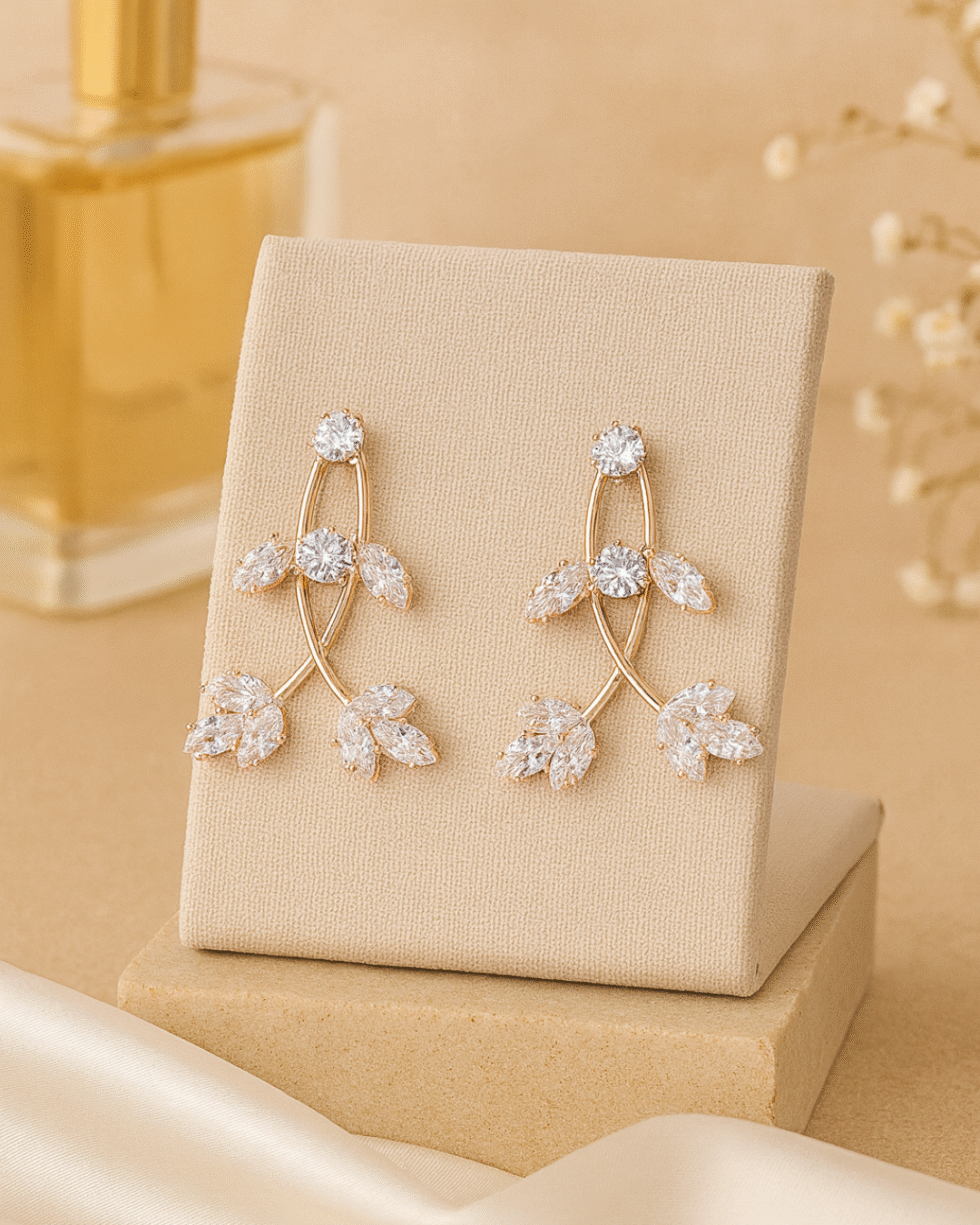 Inspired by delicate botanical silhouettes, these floral crystal earrings bring a soft, luminous elegance to any look. Designed with a graceful overlapping stem structure, each earring features a brilliant round stone at the top, followed by intricately arranged marquise-cut crystals that mimic fresh leaves glistening under sunlight. The curved gold framework adds a fluid, organic charm, giving the design a natural flow that flatters the neckline beautifully.