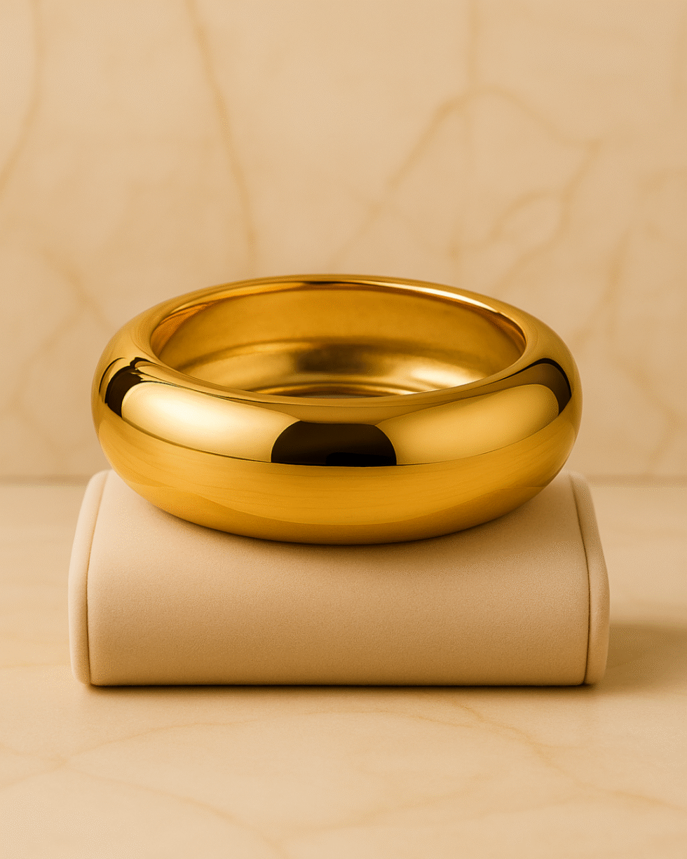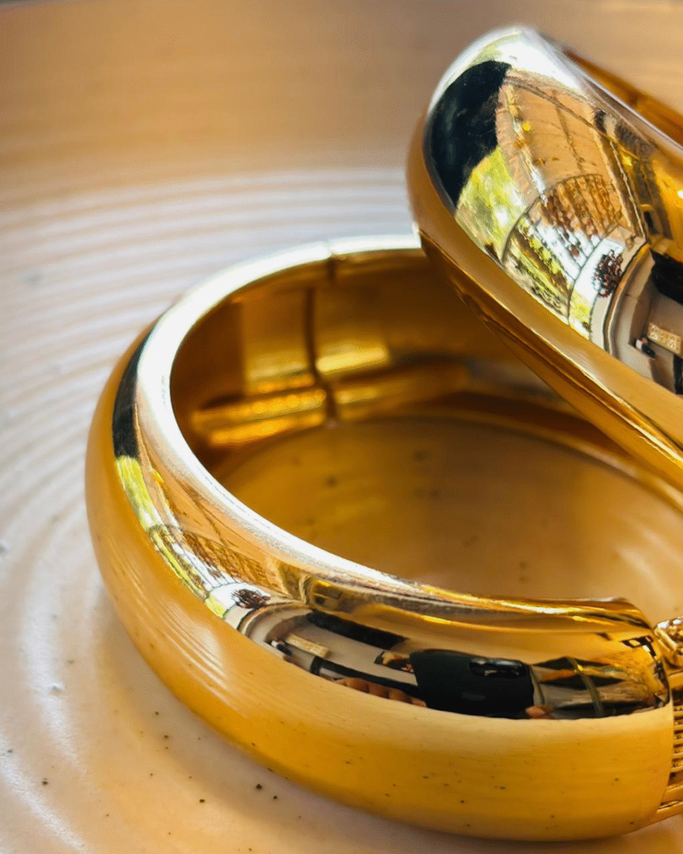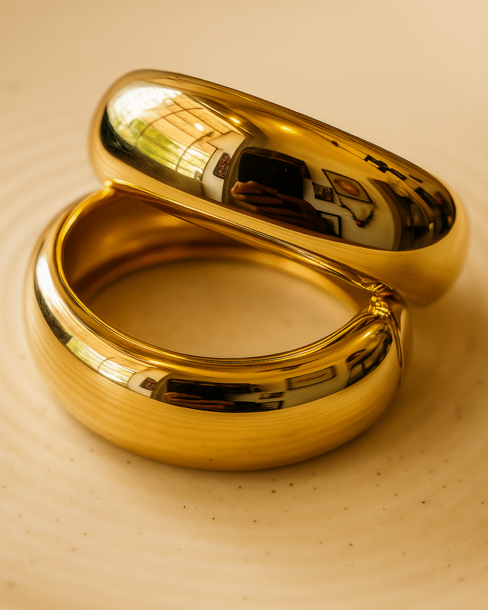The Golden Aura Bangle by VIKTAMNA is a timeless masterpiece designed for those who love effortless elegance. With its smooth, high-shine finish and bold silhouette, this statement piece exudes sophistication and luxury. Whether styled with festive attire, a chic cocktail dress, or everyday outfits, it brings the perfect balance of grace and glamour. A must-have for every jewellery lover who believes in making a statement without saying a word.