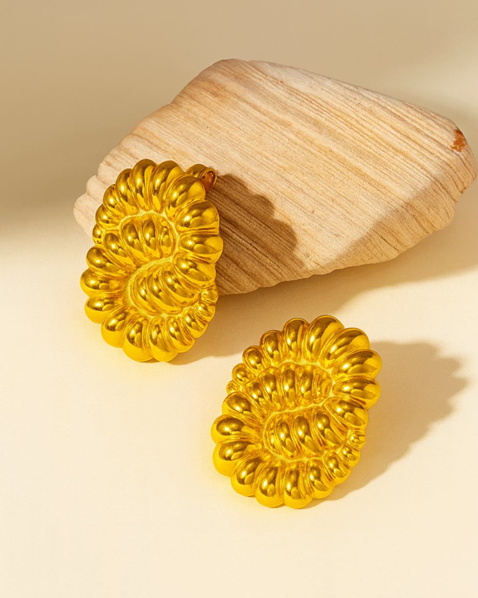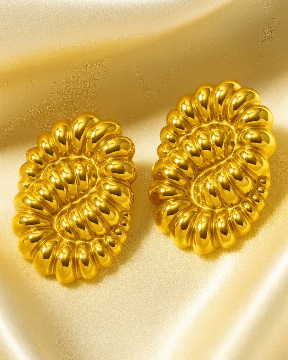 Crafted in a radiant high-shine gold finish, these statement earrings draw inspiration from sculpted organic forms and traditional metal artistry. Each piece features a beautifully contoured, rippled structure that mimics the natural symmetry of petals and shells, creating a striking play of light and shadow. The textured, inflated silhouette adds depth and dimension, giving the earrings a luxurious, hand-moulded appeal.