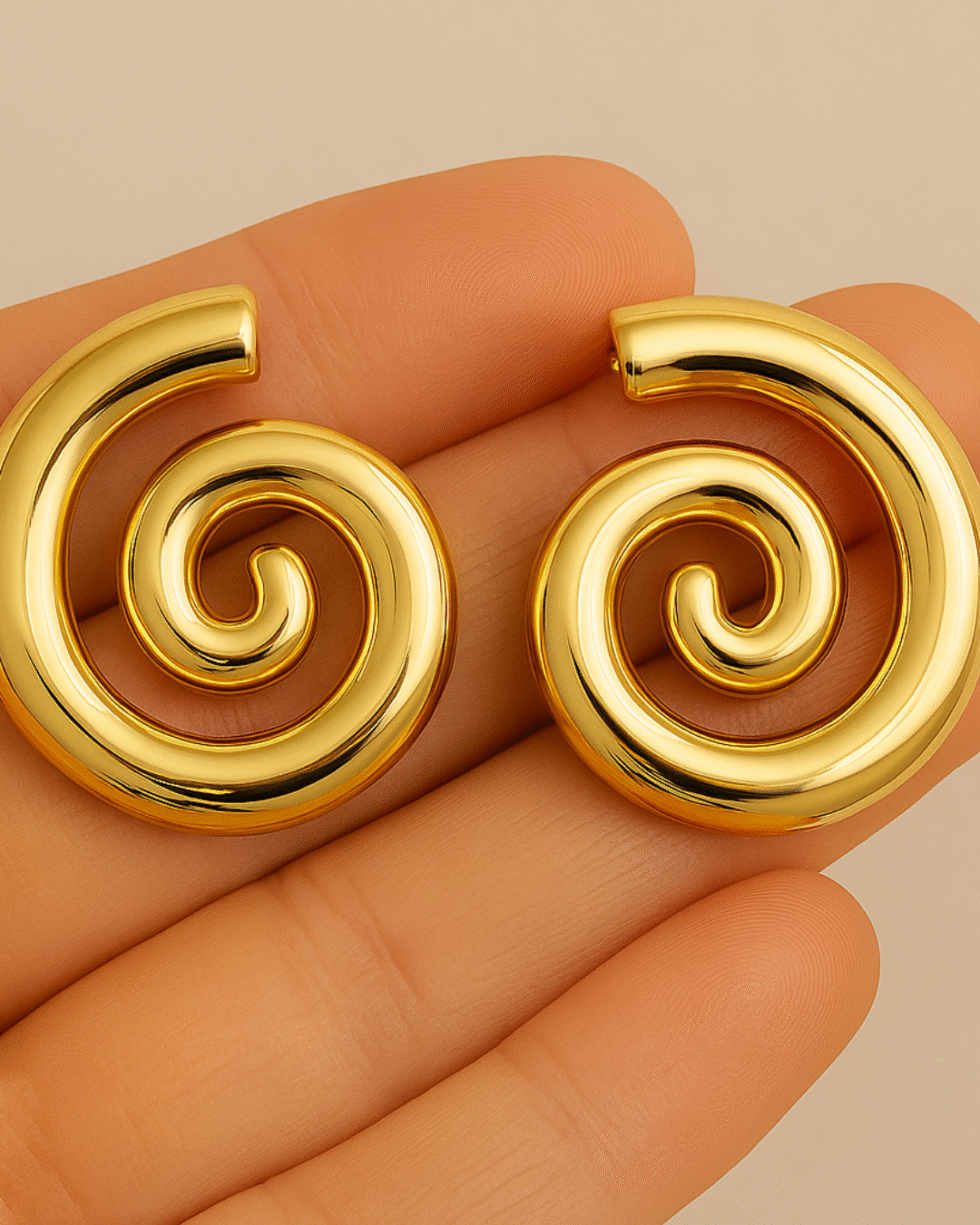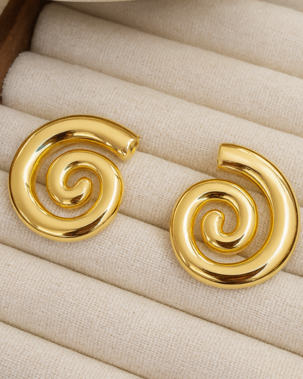 These gold spiral earrings are crafted for those who appreciate design that feels intentional — pieces that carry a sense of movement, fluidity, and quiet luxury. The sculpted swirl shape draws the eye without shouting for attention, creating a soft, flowing silhouette that naturally complements the contours of the face.