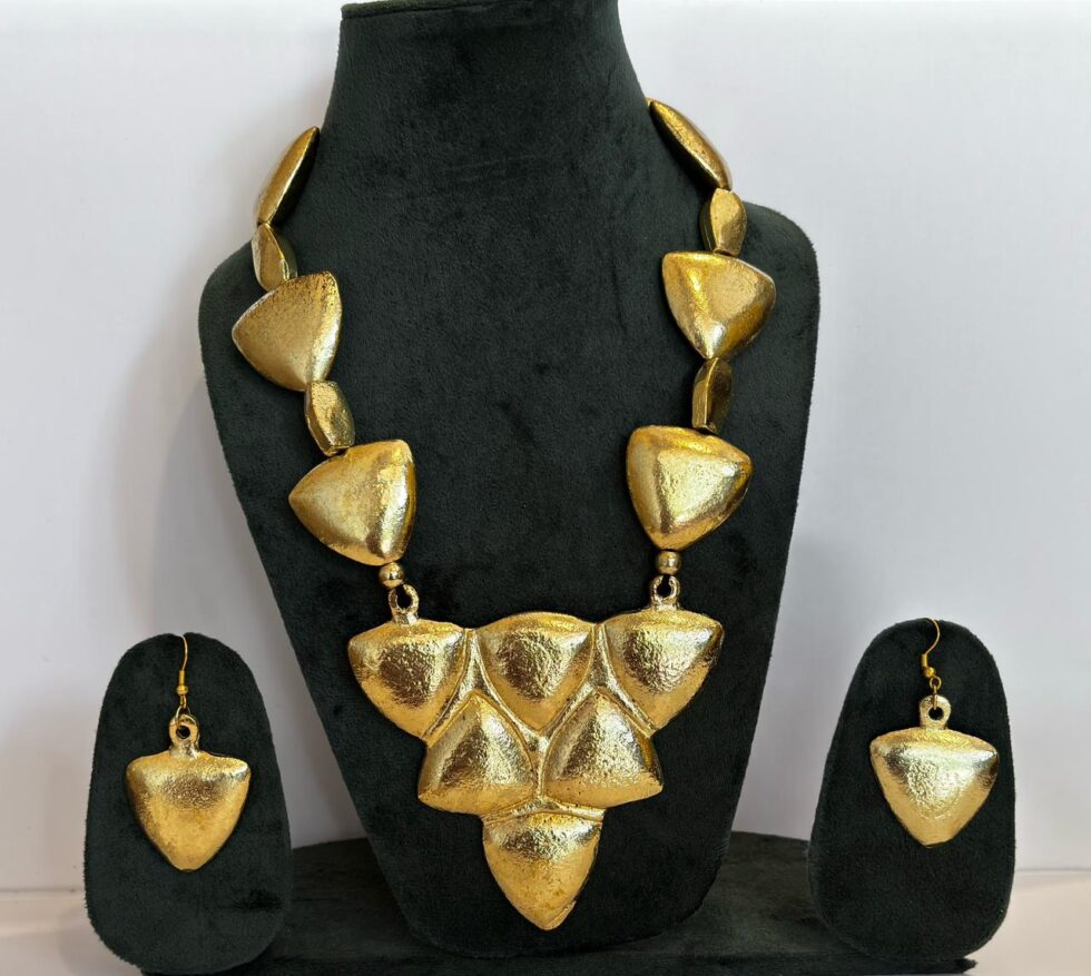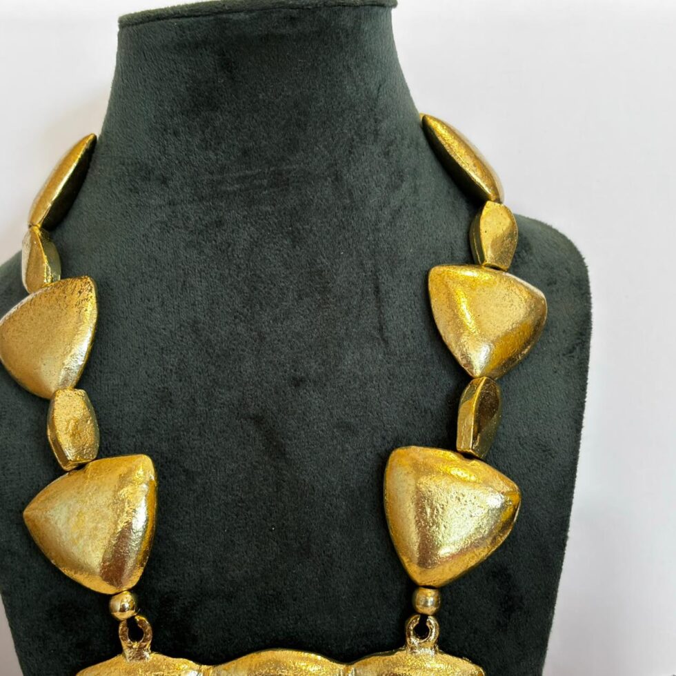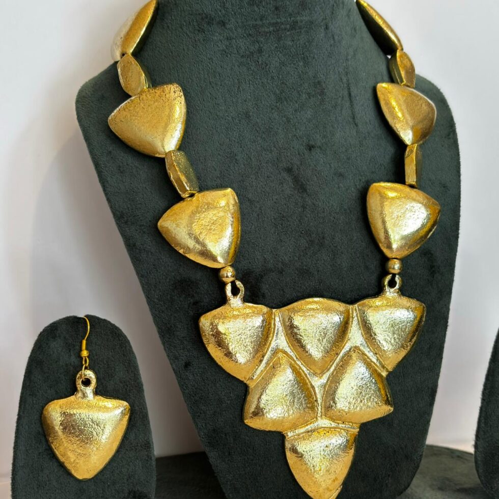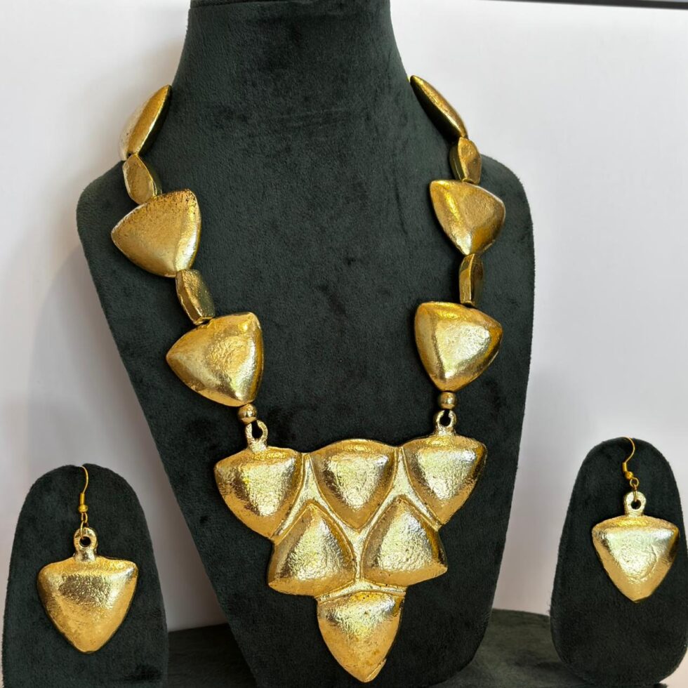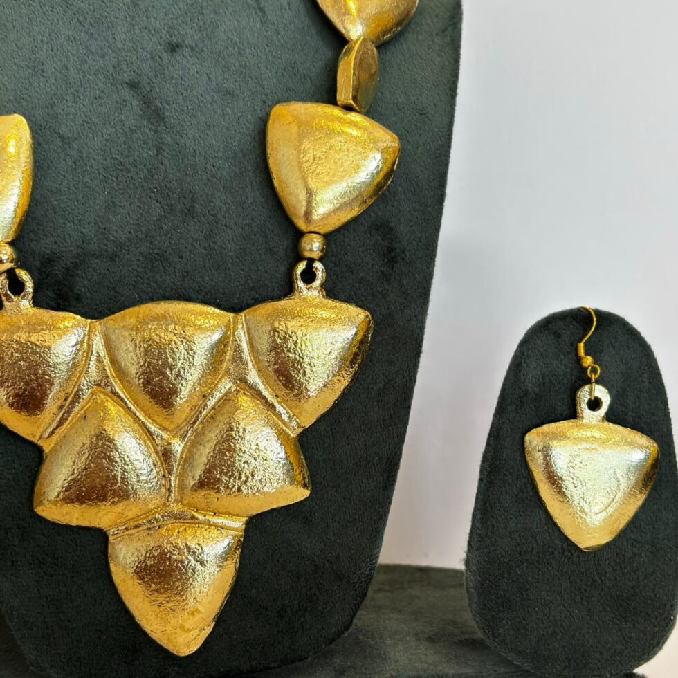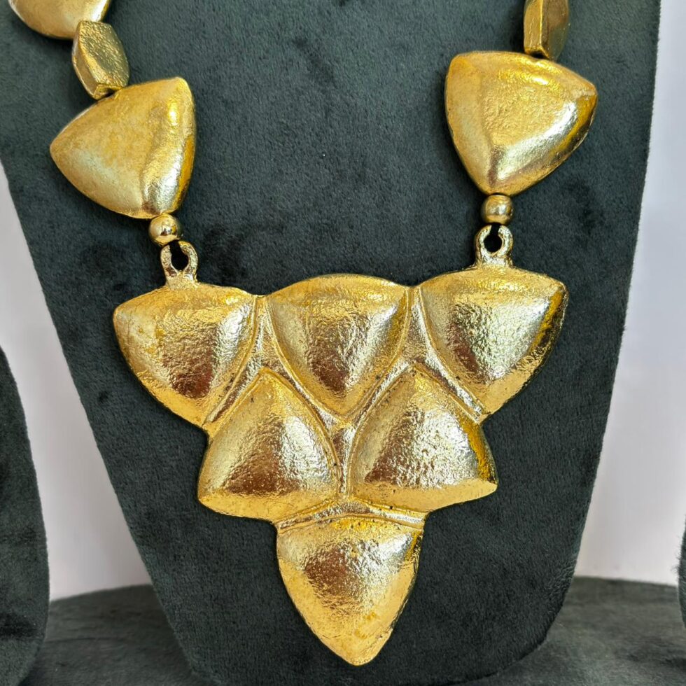 This handcrafted gold-tone necklace set stands out with its bold, shield-shaped motifs — a perfect fusion of strength and sophistication. Each element is carefully sculpted with a hammered texture that enhances its artisanal appeal and adds a rich, tactile dimension. The necklace features a symmetrical arrangement of triangular shield pieces at the center, creating a powerful statement silhouette.