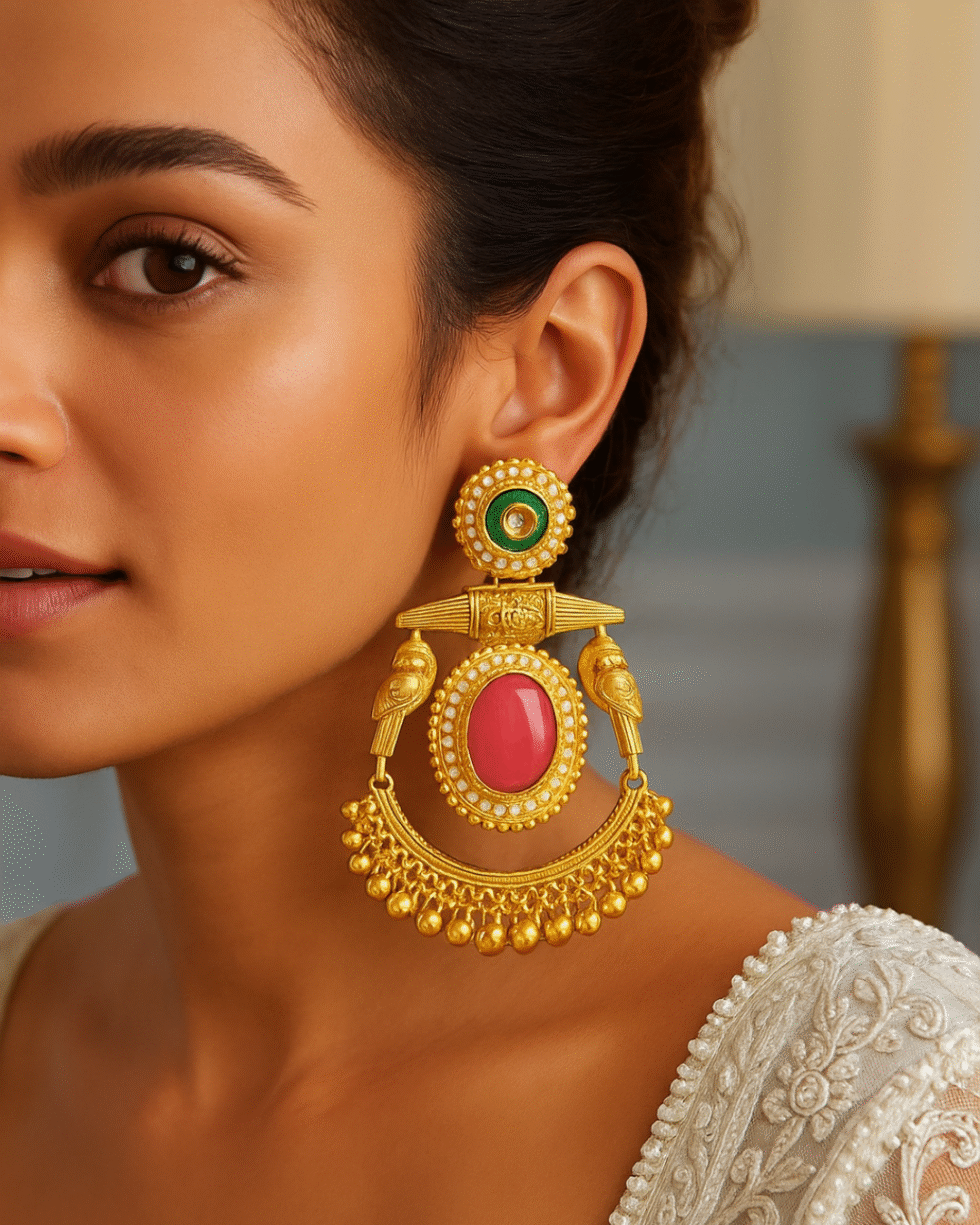 Crafted in high-polish gold, these earrings are a perfect blend of heritage and luxury, making them an ideal choice for weddings, festivals, and special occasions. They pair beautifully with traditional Indian attire and can elevate any ensemble with their statement-making charm.