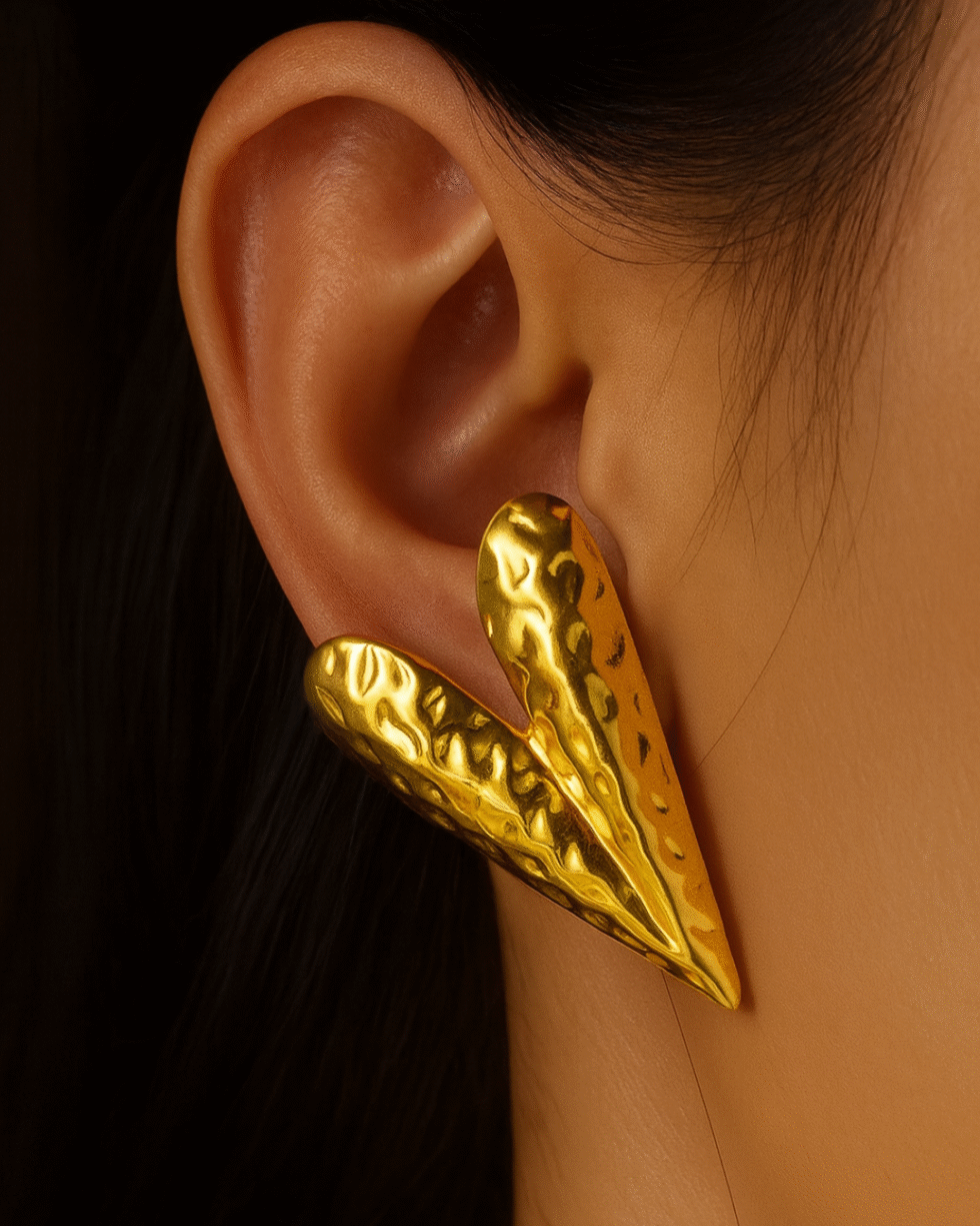 The distinctive V silhouette adds a contemporary edge, while the uneven hammered detailing gives the earrings a raw, handcrafted charm. Their high-shine gold tone makes them instantly eye-catching, elevating even the simplest outfit with a touch of luxe drama. Despite their striking presence, they sit comfortably on the ear, making them perfect for long wear — from daytime styling to evening occasions.