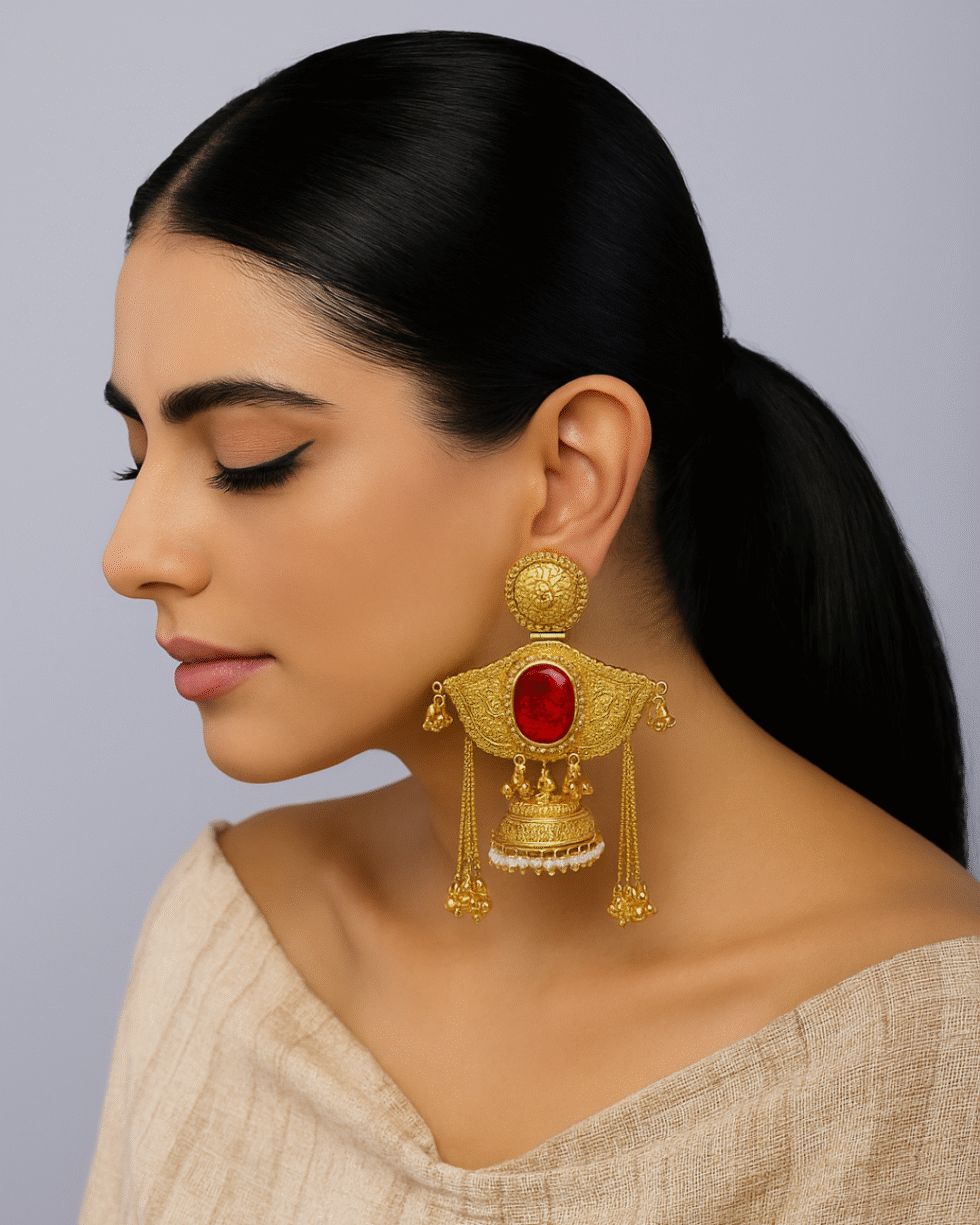 A statement masterpiece crafted in timeless temple-style artistry, these heritage earrings are designed for women who love jewellery with grandeur, story, and presence. Hand-carved in antique gold finish, the piece features an intricately embossed wing-shaped top—symbolising protection and prosperity—accented with a bold deep-red textured stone bordered by delicate pearls.