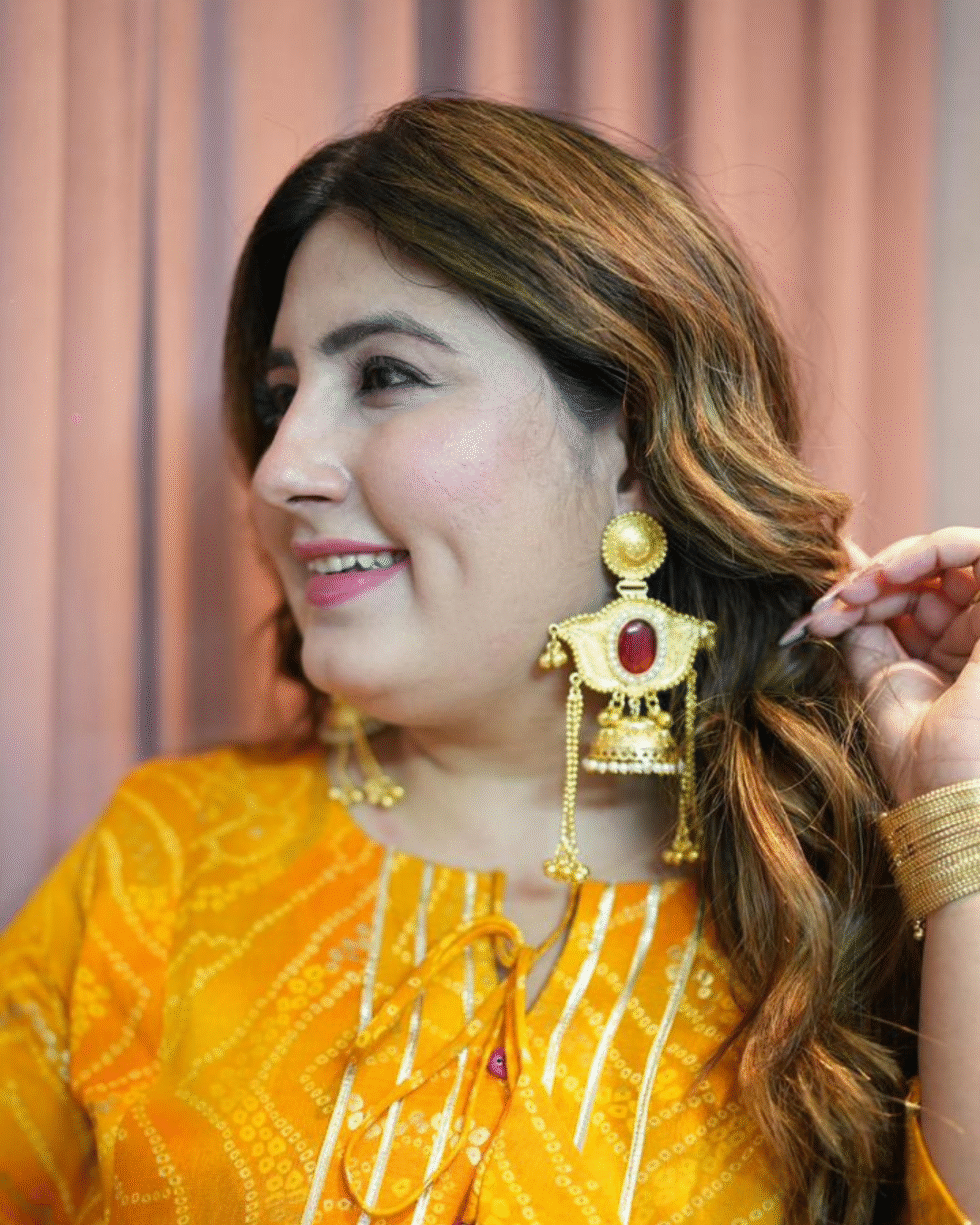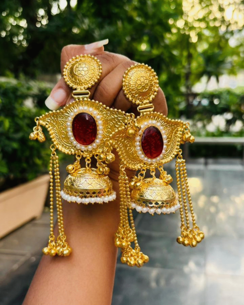 Perfect for bridal wear, festive occasions, cultural events, or heirloom collections, these earrings capture the richness of traditional craftsmanship blended with opulent aesthetics. Every element—from the engraved motifs to the natural stone centrepiece—reflects luxury, heritage, and lasting beauty.