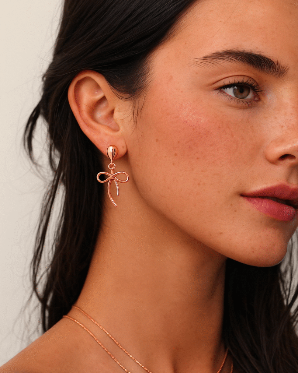 These Rose Gold Bow Earrings are crafted to capture the softness of a ribbon and the elegance of fine jewelry. Designed with a smooth teardrop stud that gently transitions into an open bow silhouette, the earrings balance femininity with contemporary minimalism. The flowing ribbon-like drops add movement and charm, giving the piece a graceful, elongated look that flatters every face shape.