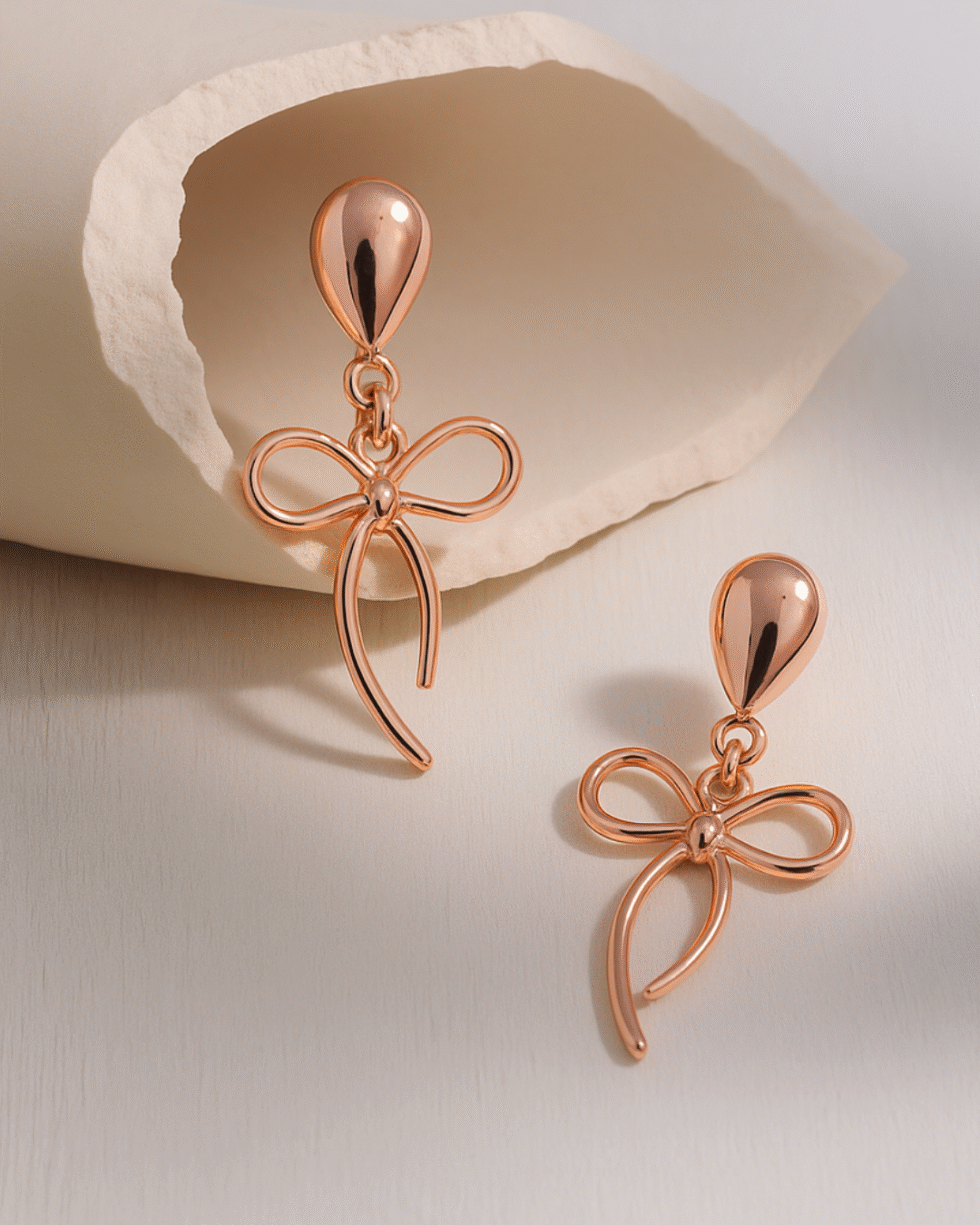 The high-polish rose gold finish brings a warm, luminous glow, reflecting light beautifully without appearing overly flashy. Lightweight and comfortable, they are perfect for long wear — whether styled with everyday outfits, brunch looks, or chic evening ensembles. Their delicate structure makes them versatile, while the bow motif adds a touch of romance and sweetness.