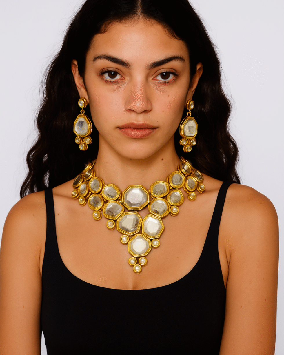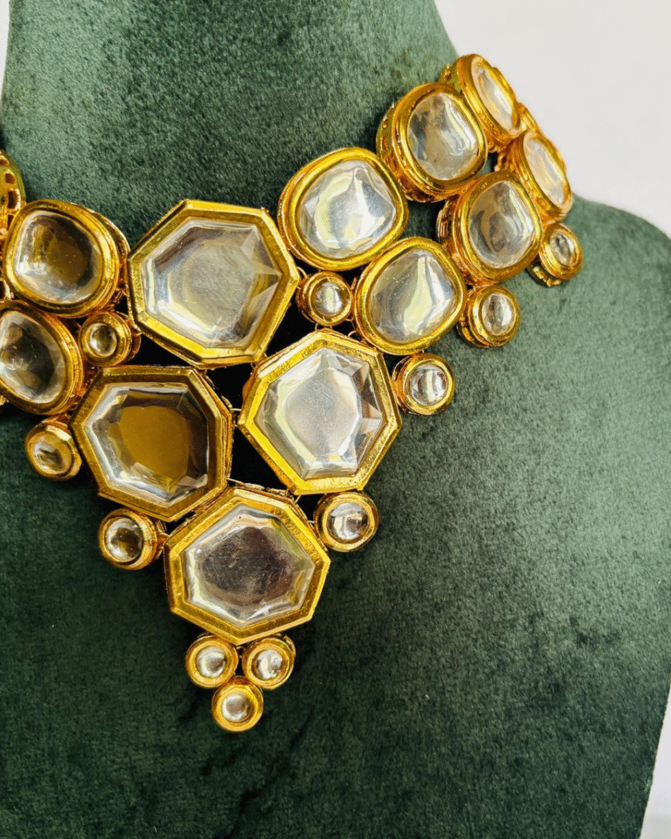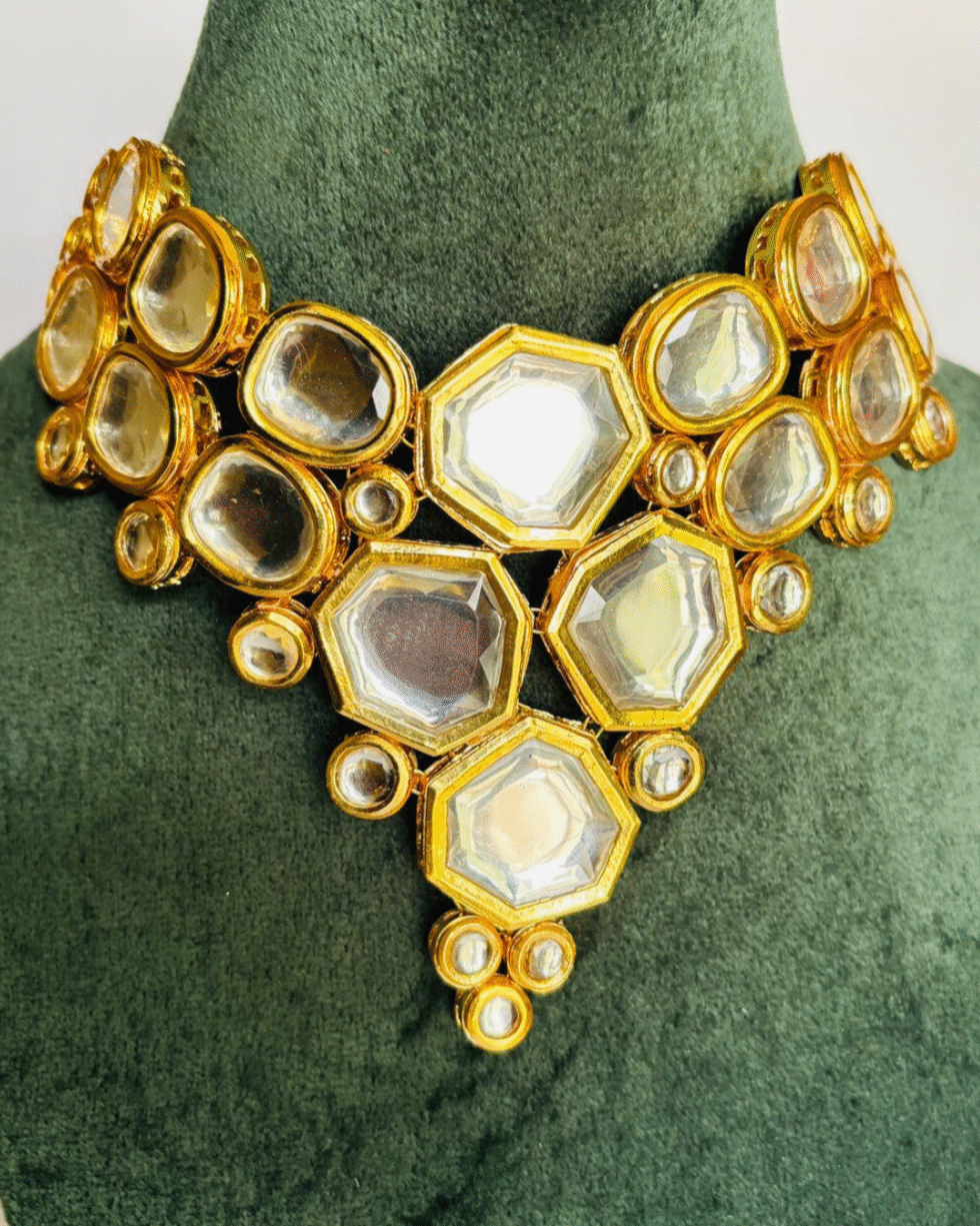 Make a statement of timeless elegance with this Royal Kundan Mirror Choker Set. Meticulously handcrafted, this set features a stunning arrangement of mirror-cut glass framed in rich gold tones, designed to reflect light beautifully with every movement. The necklace’s layered hexagonal and circular motifs create a regal silhouette that draws inspiration from royal Indian heritage.