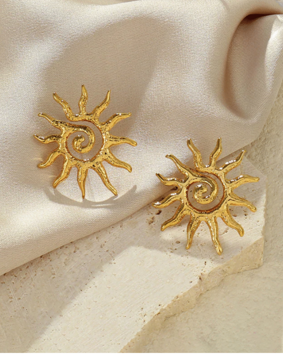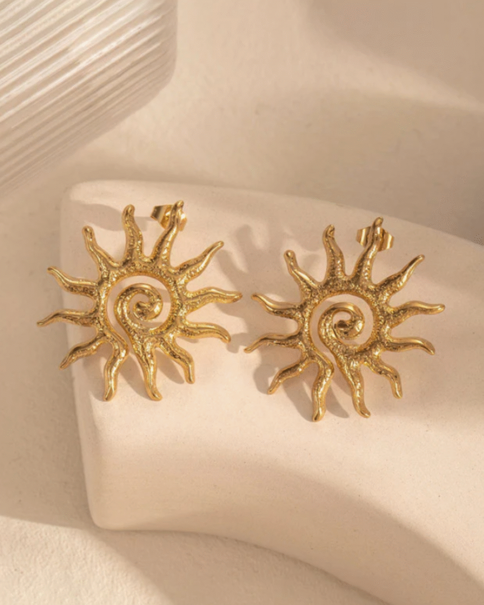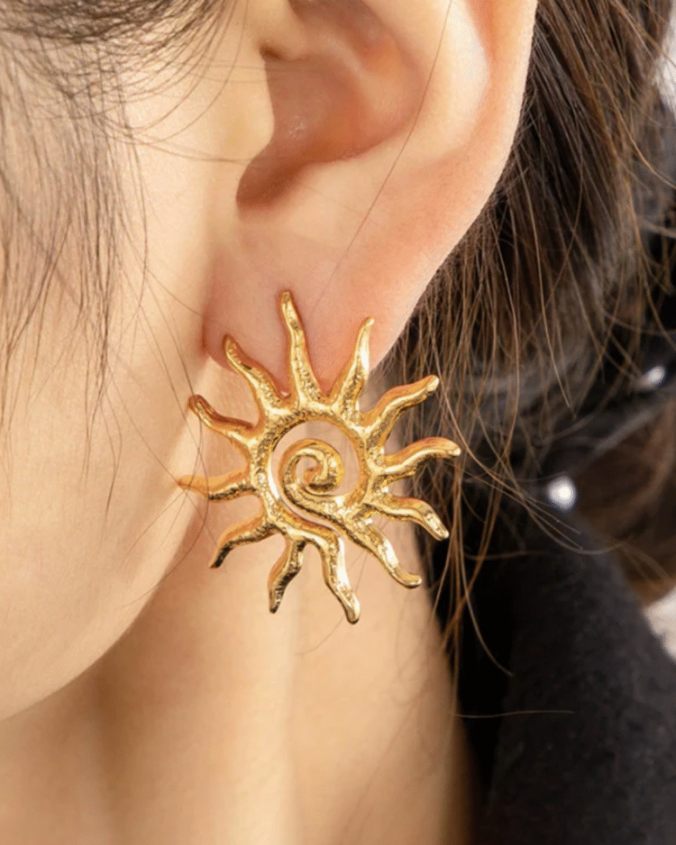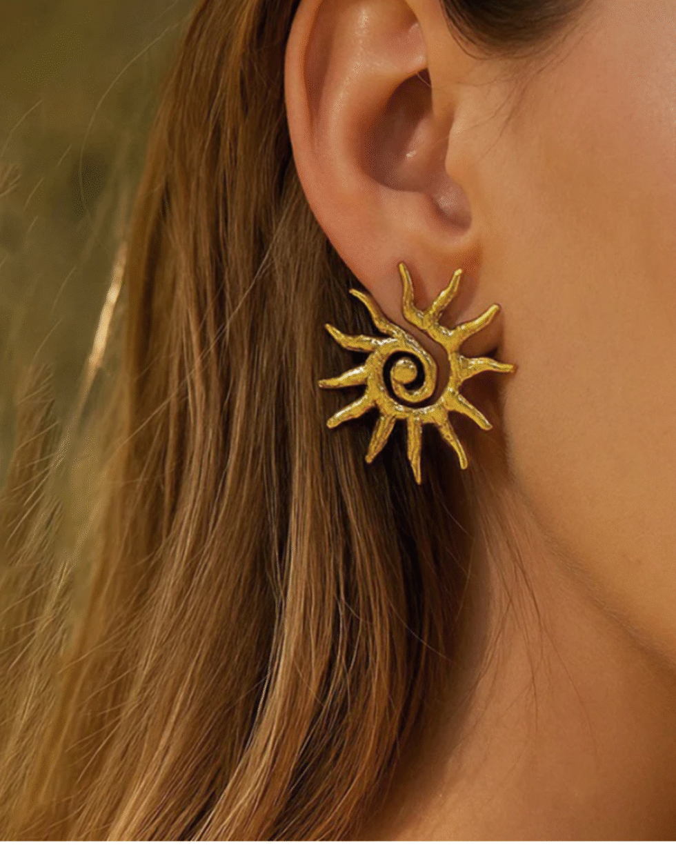 Inspired by the warmth of the rising sun, these handcrafted gold-toned earrings bring a soft radiance to every look. Designed with a swirling centre and sculpted rays, they carry a beautiful blend of modern artistry and timeless charm. Each piece reflects a subtle texture that catches light effortlessly, creating a natural glow even in the simplest setting.