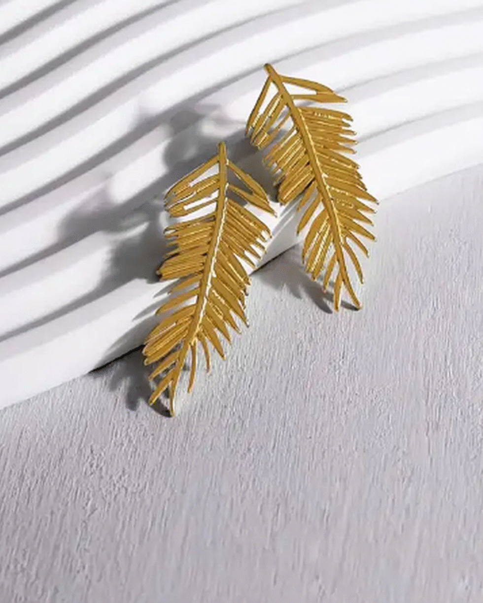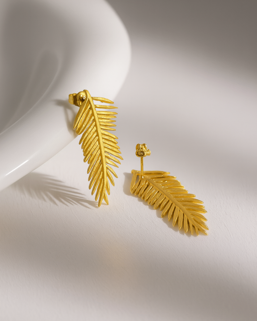 Inspired by nature’s quiet poetry, these Golden Feather Earrings capture the delicate movement of a drifting leaf frozen in time. Crafted with precision, each earring features fine, tapering filaments that mimic the natural texture of a real feather—light, airy, and graceful.