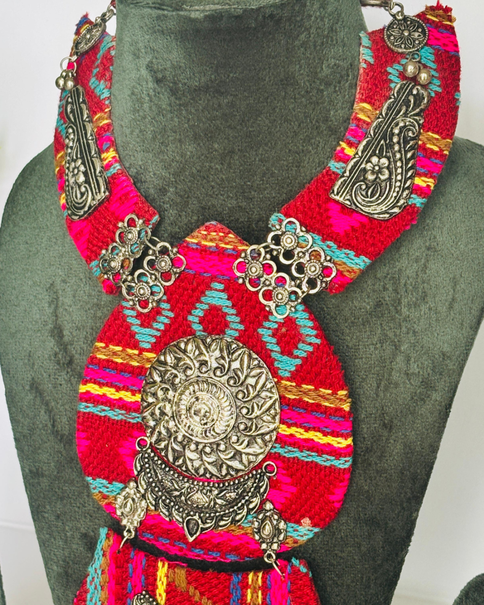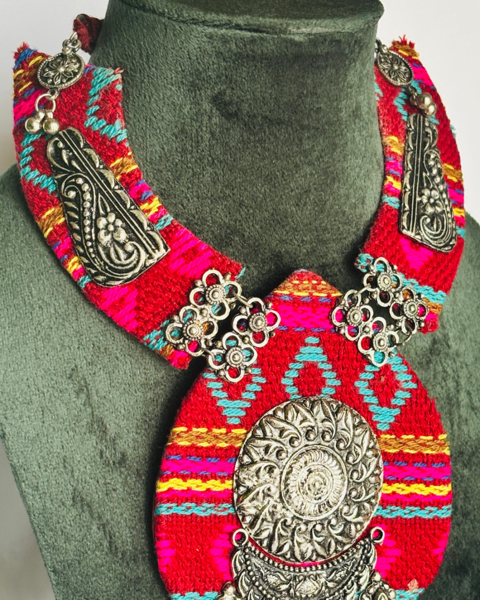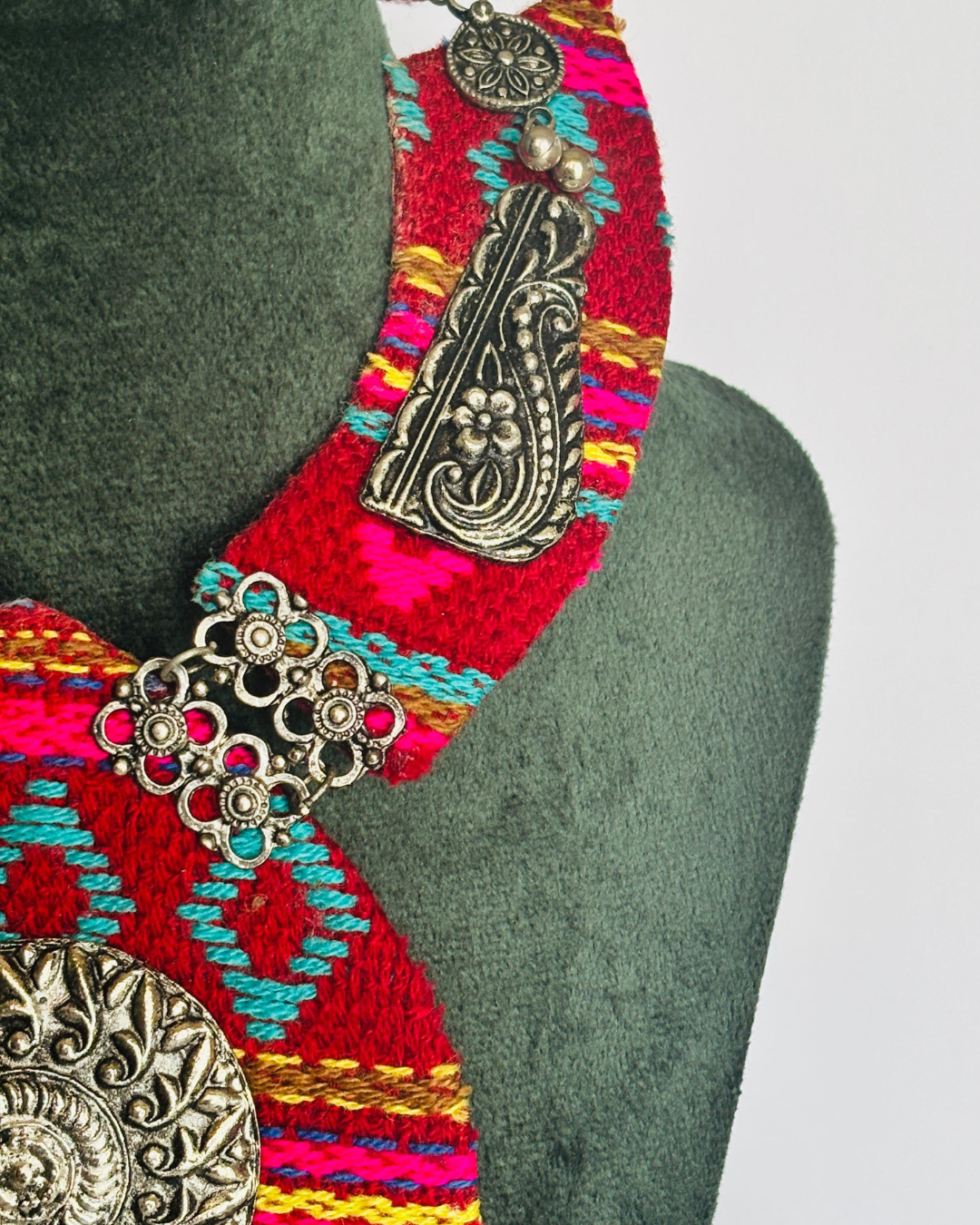 At the heart of the necklace lies a beautifully detailed antique silver medallion, inspired by tribal and folk motifs. Surrounding it are ornate silver elements, floral carvings, and engraved metal plates that add depth, texture, and old-world charm.
