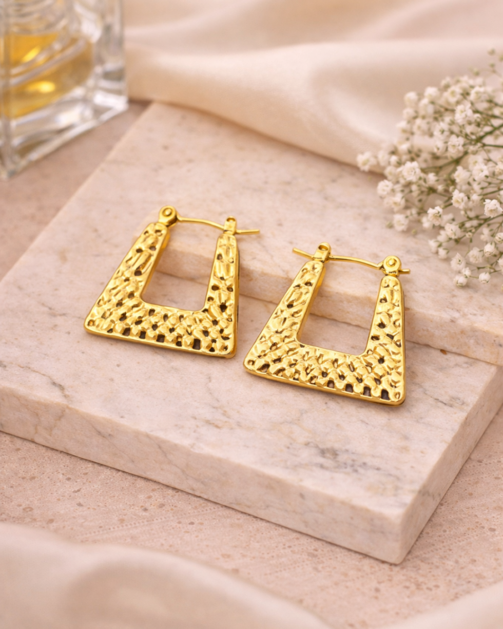 Bold and elegant trapezoid-shaped earrings with a rich gold finish and textured detailing. Lightweight yet striking, perfect for everyday styling as well as festive and party looks. Crafted to add a modern statement touch to any outfit by VIKTAMNA